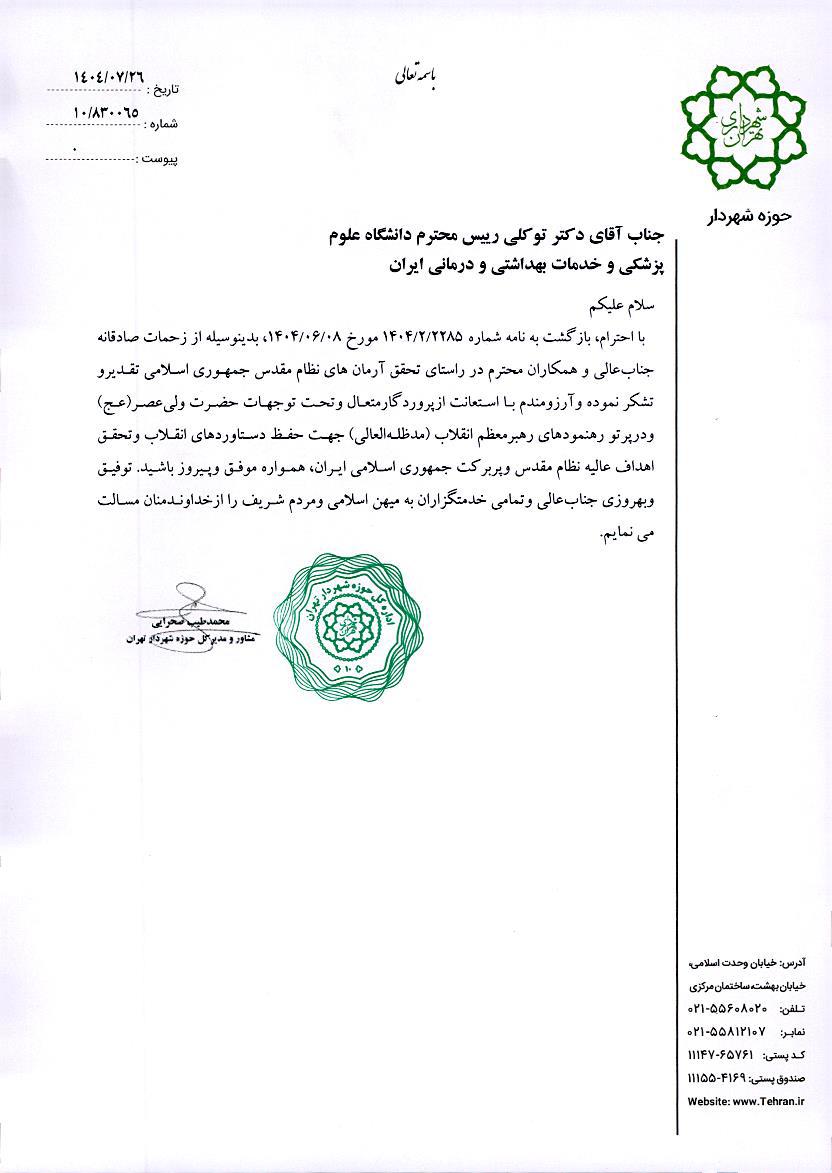 تقدیر و تشکر از ریاست محترم دانشگاه علوم پزشکی ایران توسط شهرداری محترم تهران